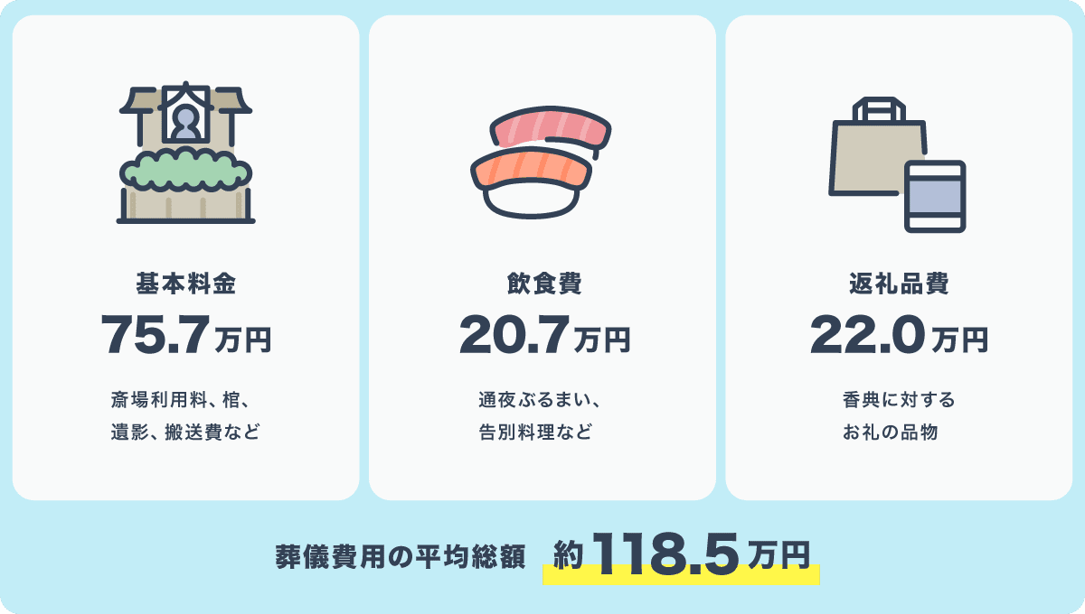 株式会社鎌倉新書が行った「第6回 お葬式に関する全国調査(2024年)」によると、葬儀費用の平均総額は約118.5万円という結果でした。